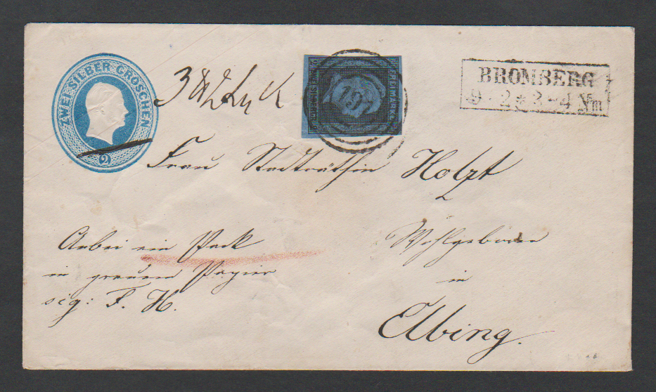 "191" nebst Ra2 "Bromberg" auf Ganzsache 2 Sgr., mit ZuF 2 Sgr. als Pracht-Paketbegleitbrief