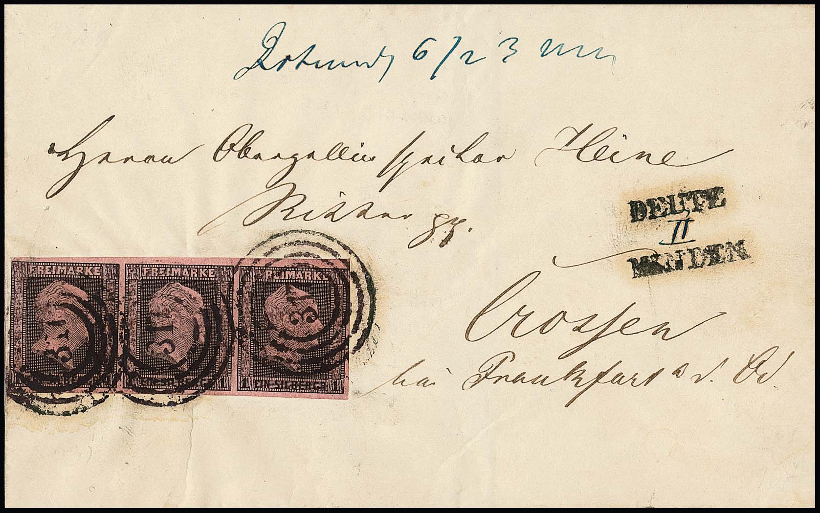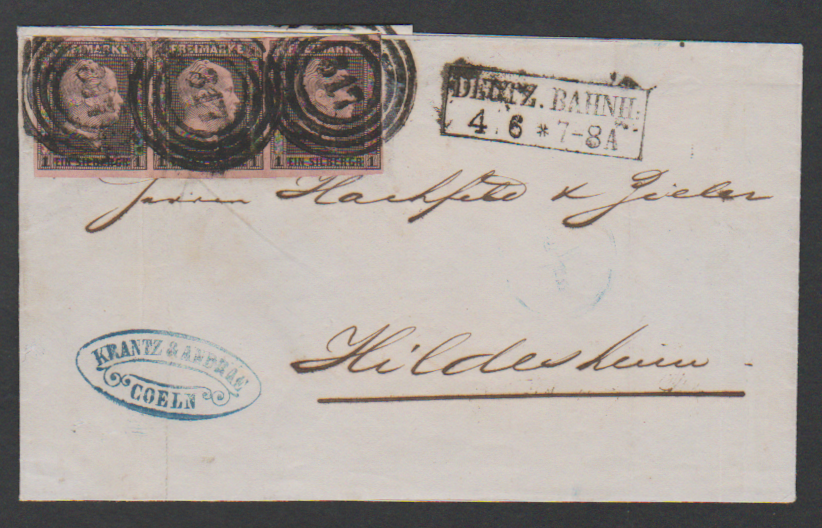 "317" nebst Ra2 "Deutz Bahnhof" auf Prachtbrief mit Dreierstreifen 1 Sgr.