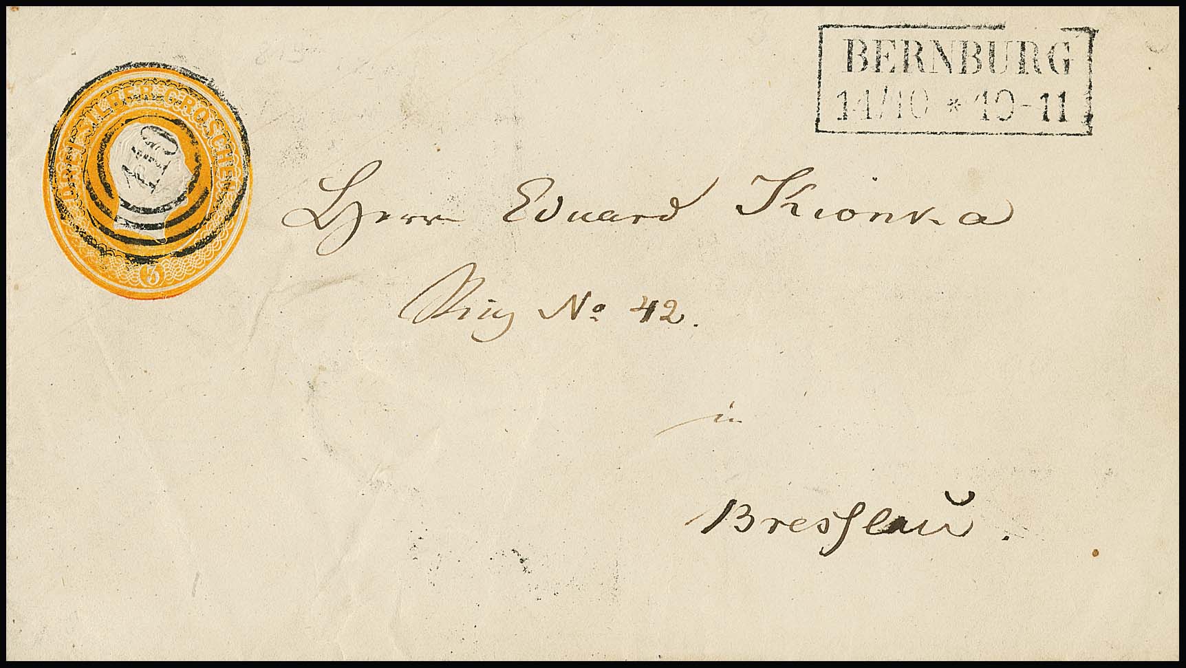 "110" nebst Ra2 "Bernburg" klar auf Kopf-Ganzsache 3 Sgr. gelborange, sign. Kastaun