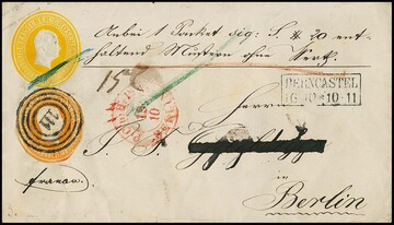 "111" nebst Ra2 "Berncastel" klar auf Ganzsache 3 Sgr. gelb, nebst rundgeschnittenem Kopf-Ganzsachen-Ausschnitt 3 Sgr. orange als Paketbrief nach Berlin (Adreßname überschrieben)