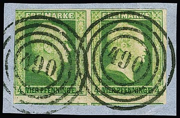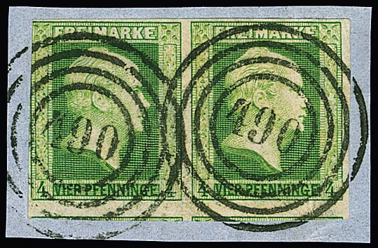 "490" (Mönchengladbach) klar auf Briefstück mit Paar 4 Pfge. grün, linke Marke berührt, rechte überrandiges Luxusstück