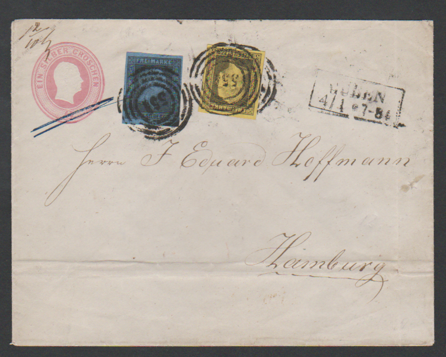 "554" nebst Ra2 "Guben" auf Ganzsache 1 Sgr. rosa im Großformat, nebst gut gerandeten 2 und 3 Sgr. als Doppelbrief nach Hamburg, offensichtlich erst eine falsche Wertstufe aufgeklebt und dann die 3 Sgr. korrekt, Couvert Faltspuren ausserhalb