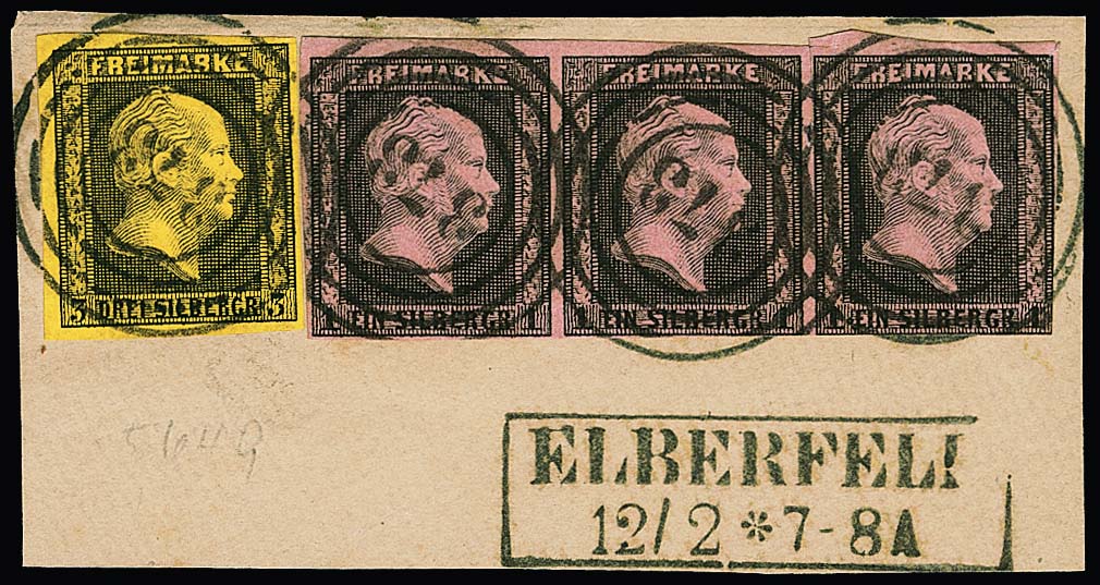 "373" nebst Ra2 "Elberfeld" auf Briefstück mit Dreierstreifen 1 Sgr. schw./rosa (rechte Marke etwas ber.) nebst 3 Sgr.
