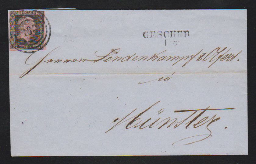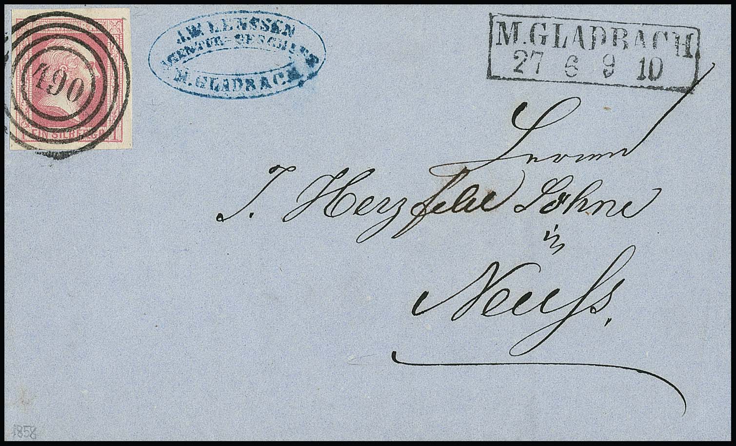 "490" nebst Ra2 "M. Gladbach" auf schönem Kabinettbrief mit breitrandiger 1 Sgr. rosa