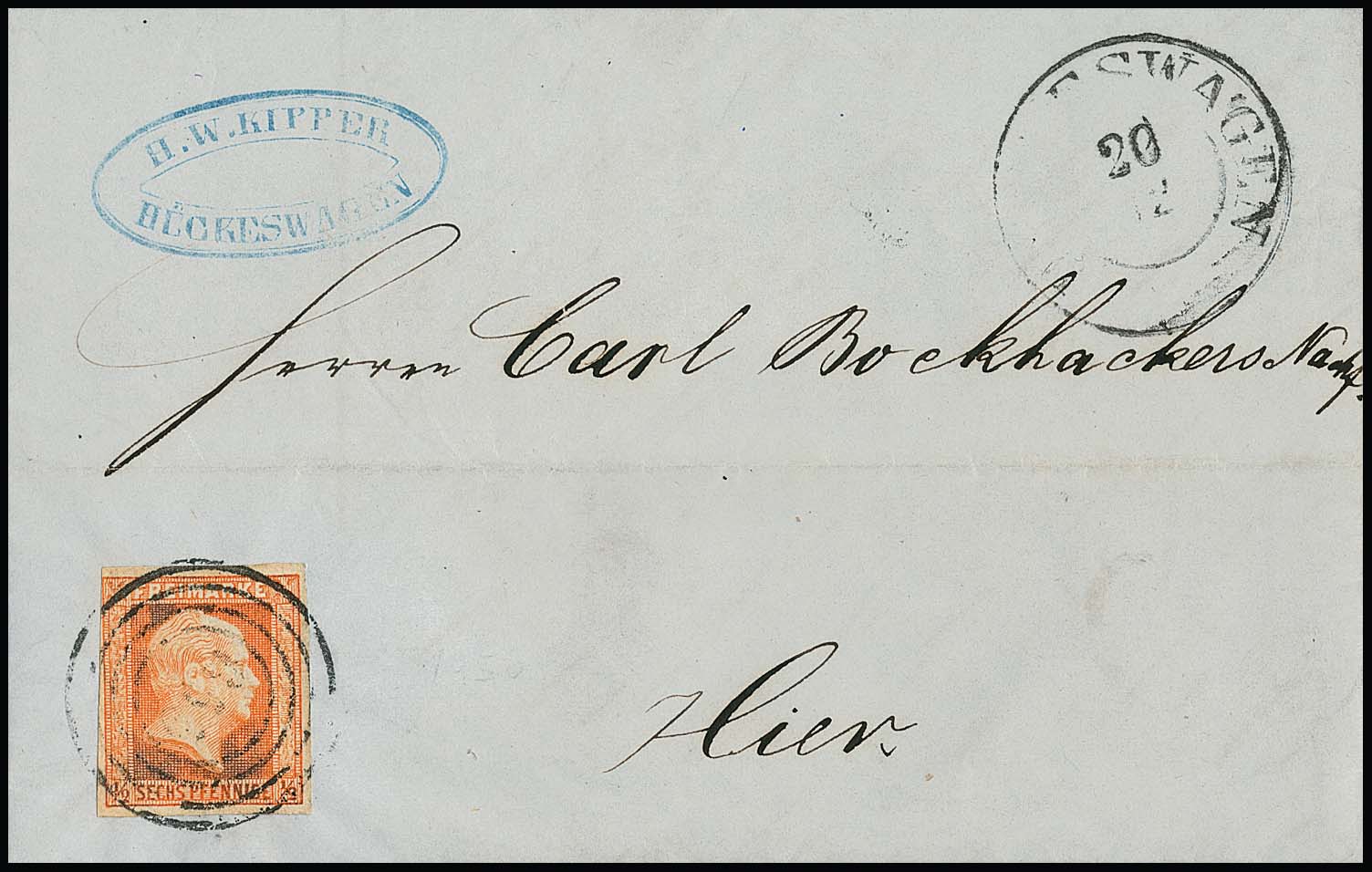 "655" zart nebst K2 "Hückeswagen" auf gef. Pracht-Ortsbrief 1858 mit seltener Einzelfrankatur 1/2 Sgr. Mi. 600,- + Feuser 300,-