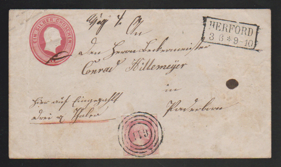 "611" nebst Ra2 "Herford" auf Ganzsache 1 Sgr. rosa (diese in Gebrauchserhaltung) mit Prachtstück 1 Sgr. als ZuF