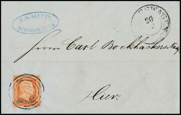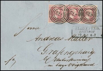 "373" nebst Ra2 "Elberfeld" auf zwei Briefen 3 Sgr. schw./gelb (einer nach Amsterdam), sowie nebst Ra3 "Elberfeld Bahnhof" auf Brief mit dreimal 1 Sgr. karmin