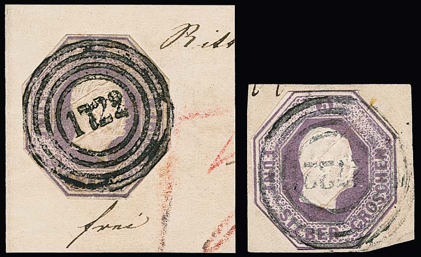 "1722" (Züllichau) auf Briefstück mit üblich achteckig geschnittenem Oktogon-Ganzsachen-Ausschnitt 5 Sgr. grauviolett, sign. Engel, sowie weiterem Oktogon-Wertstempel auf Unterlage