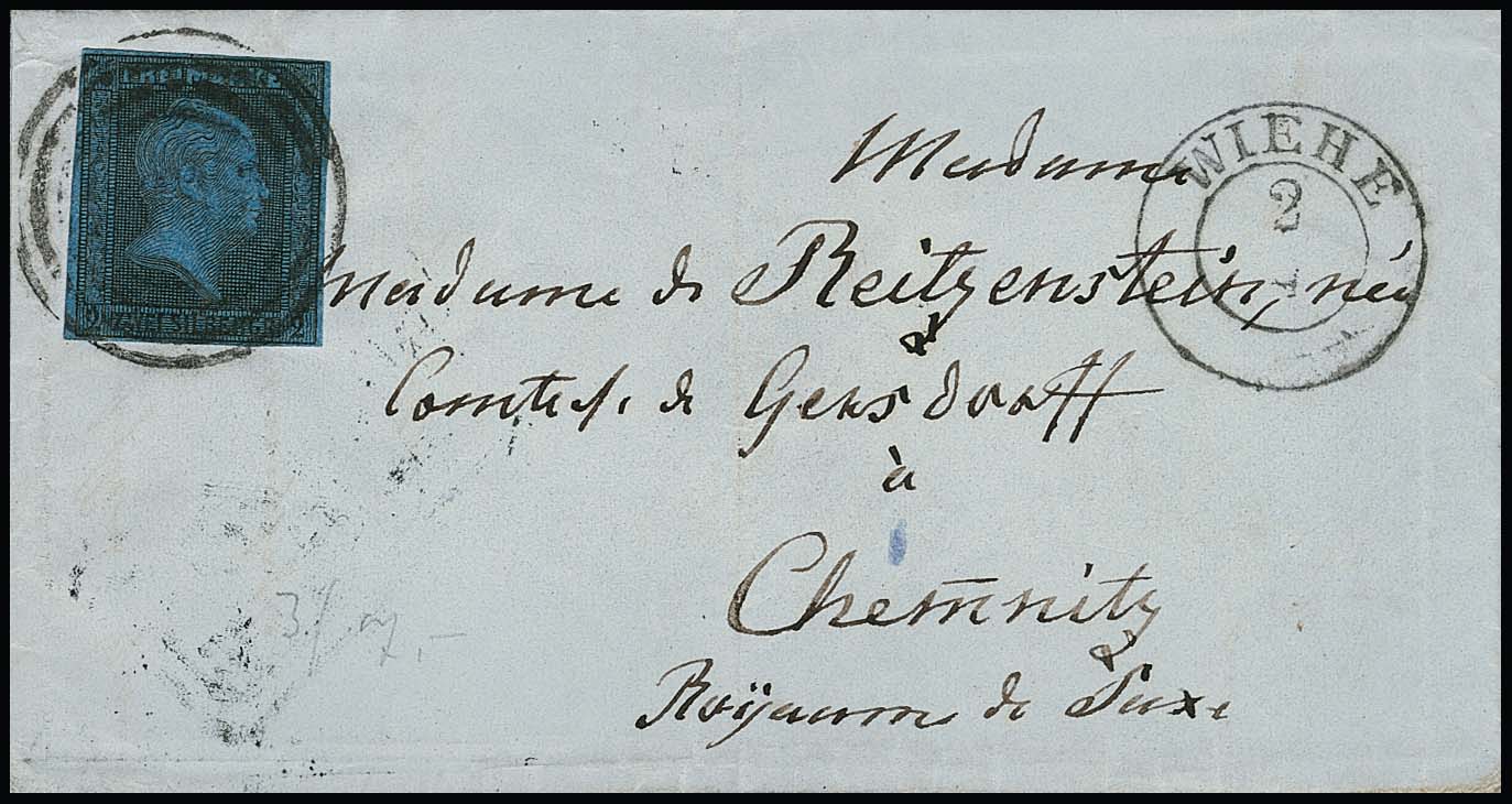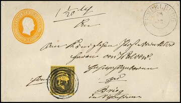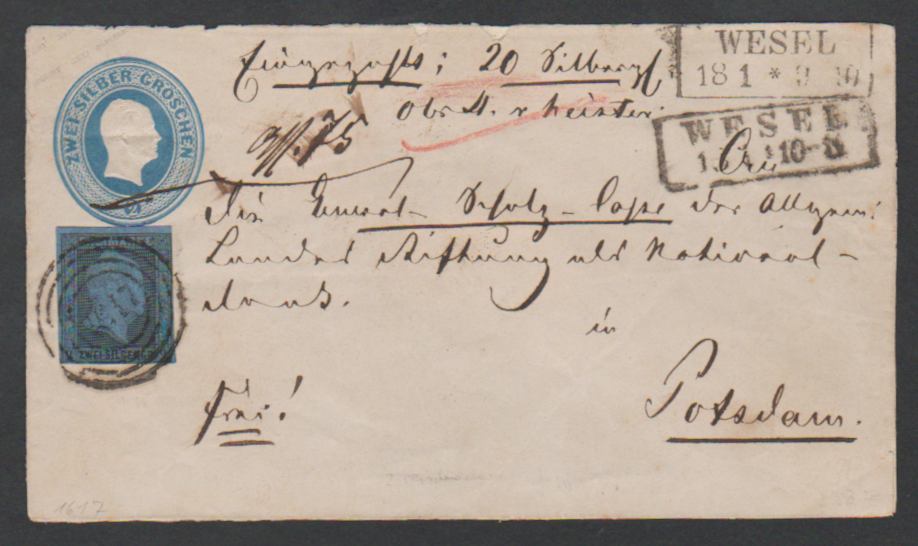"1617" nebst zwei verschiedenen Ra2 "Wesel" auf Ganzsache 2 Sgr. blau (min. Randfehler) mit ZuF 2 Sgr.