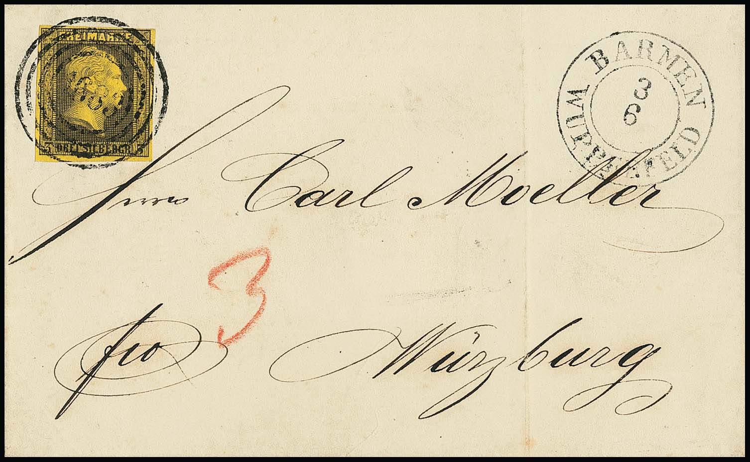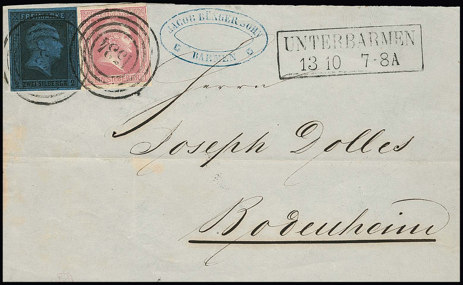 "1534" nebst Ra2 "Unterbarmen", bzw. Ra3 "Barmen-Unterbarmen", auf Briefvs. mit besserer Kombination 2 Sgr. schw./blau und 1 Sgr. rosa, bzw. Brief 1 Sgr., kl. Mgl.