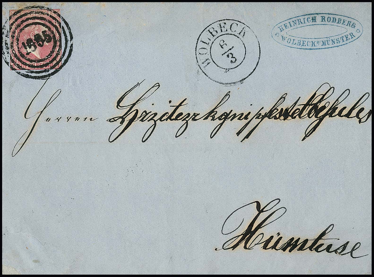 "1665" nebst K2 "Wolbeck" auf Brief mit 1 Sgr. (ringsum berührt geschnitten). Es sind nur wenige Briefe dieses sehr seltenen Nummernstempels bekannt. Typisch veränderte Adresse in Münster