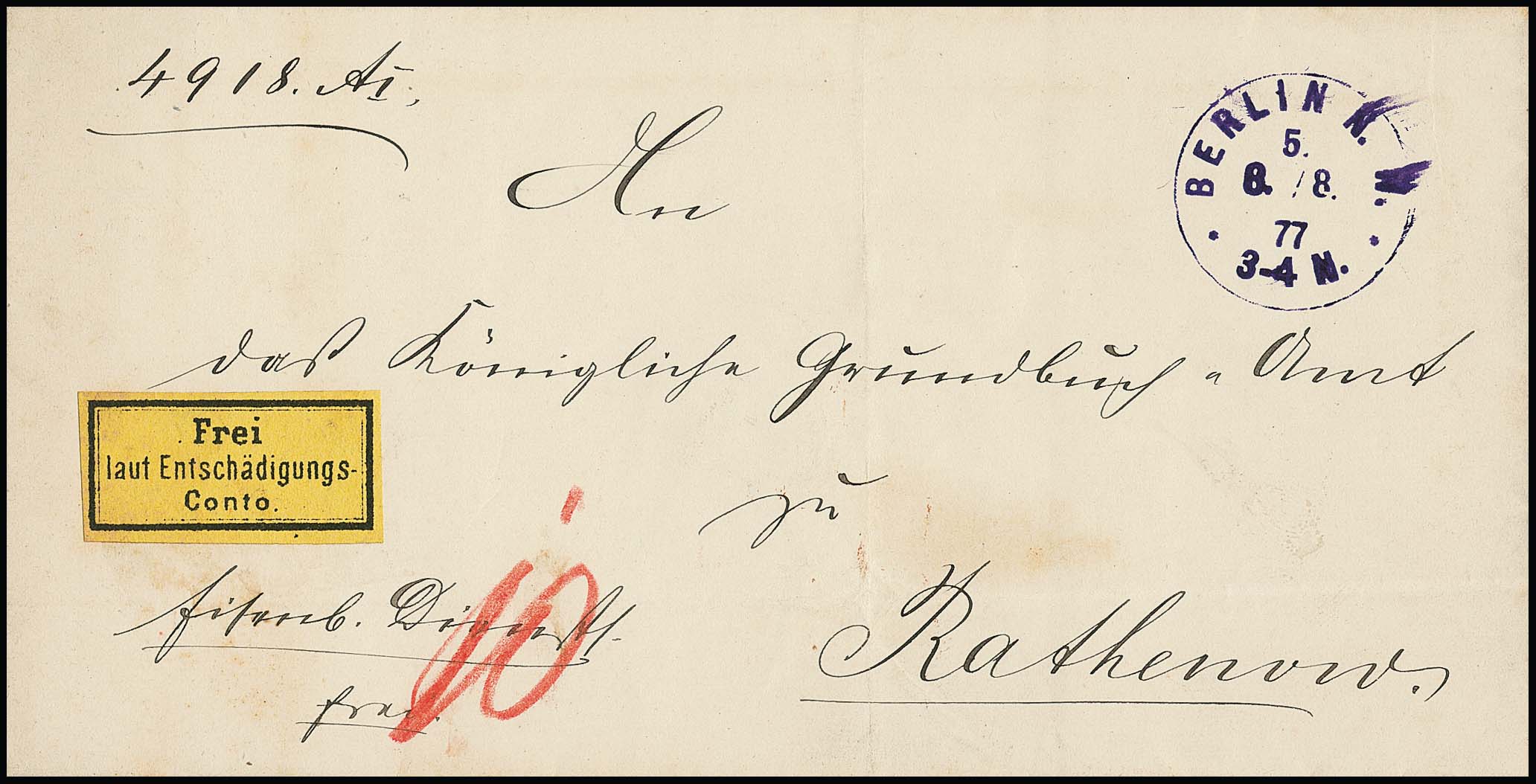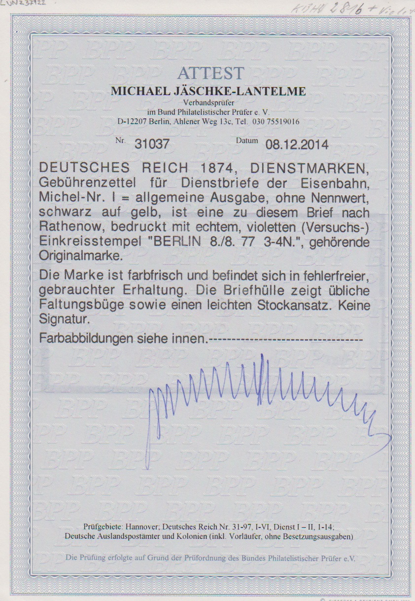 "Berlin N.W.5", seltener violetter Versuchs-K1 vom 8.8.1877 klar auf gef. Dienstbrief mit gut gerandeter Dienst "Frei laut Entschädigungs-Conto", Attest Jäschke-L.