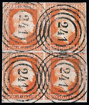 1/2 Sgr. ziegelrot im Pracht-Viererblock vom linken Bogenrand (Vortrennschnitt nur im Zwischenraum) mit Federzug-Entwertung, sign. Balasse