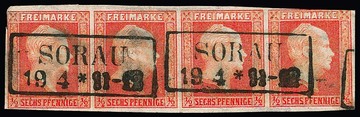 1/2 Sgr. ziegelrot, seltener Viererstreifen mit Ra2 "Sorau", die beiden Aussenmarken berührt bzw. kleine Mängel. Mi. 1000,-