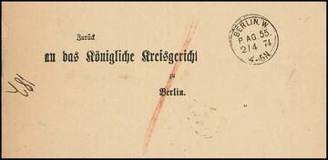 "Berlin W. P. AG. 55", sehr seltener K1 in bisher frühest bekannter Verwendung, 2.4.1874, auf Orts-Beh.-Schein, KHBW Nr. 691