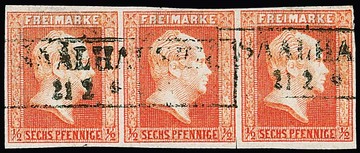 1/2 Sgr. ziegelrot, Pracht-Dreierstreifen mit Ra2 von Saalhausen, kleiner Vortrennschnitt nur im Zwischenraum = kein Mangel, Mi. 300,-