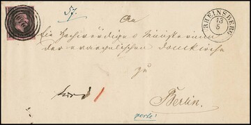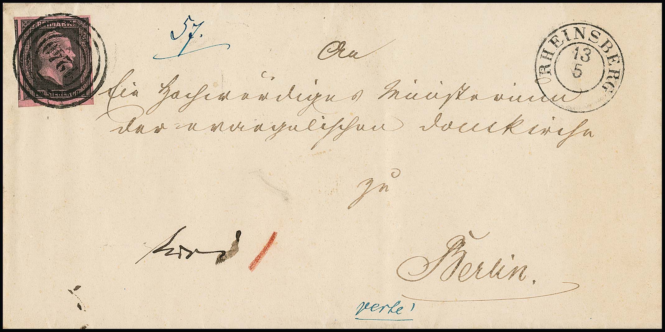 1 Sgr. schw./dunkelrosa, überrandig, auf Luxusbrief (aus Mai 1851) mit NS "1240" und K2 "Rheinsberg" nach Berlin (versch. Zustellversuche), sign. Brettl