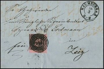 1 Sgr. schw./dunkelrosa, größere rechte untere Bogenecke, leider oben von Briefbug getroffen, auf Brief aus Naumburg, sign. Banker, Flemming