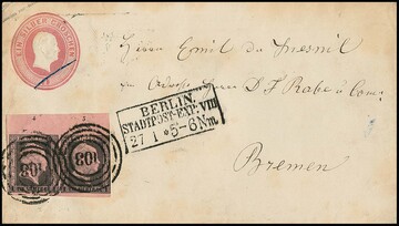 1/2 Sgr. ziegelrot auf Ganzsache 3 Sgr. gelb, mit Ra2 "Rheinberg" als Silvester-Expreßbrief nach Cöln. Rs. kleine verklebte Öffnungsmängel rund um den großen roten Firmenaufkleber der noch heute bestehenden Schnaps-Brennerei Underberg. Vs. ungewöhnlicher handschriftlicher Vermerk "Couvert wird zurückerbeten", was auf einen frühen philatelistischen Wunsch schliessen läßt. Attest Brettl