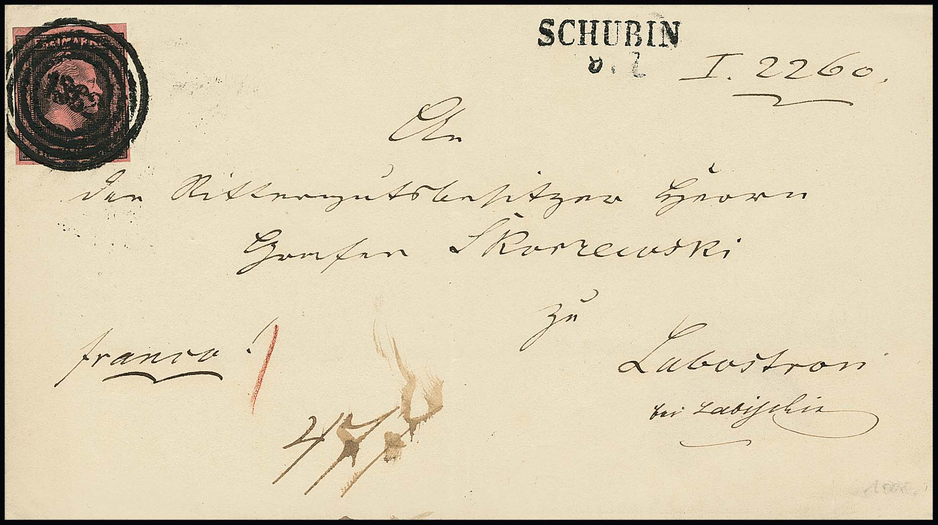 1 Sgr. schw./feuerrot, schöne und typische Nuance, Kabinettstück auf Faltbrief (ohne Seitenklappen links und rechts) mit klarem NS "1362" und L2 "Schubin", sign. Kastaun. Mi. 1800,-