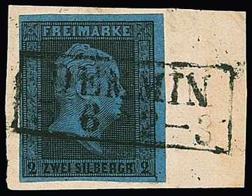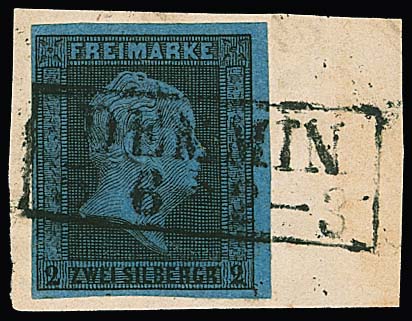 2 Sgr. schw./blau, gut geschnitten, nebst sehr breitrandig achteckig geschnittenem Oktogon-Ganzsachen-Ausschnitt 4 Sgr. rotbraun, auf Prachtbriefstück (in der Durchsicht leicht getönt) mit NS "103", sign. Banker, Grobe. Mi. 500,- ++