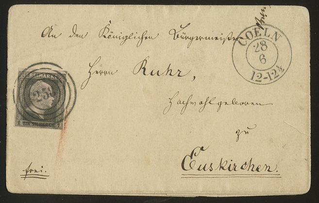 1 Sgr. schw./lilarosa, typische Farbvariante, auf kl. Faltbrief vom 28.6.(1851) von Köln nach Euskirchen, Briefpapier kl. Mgl. Mi. 350,-