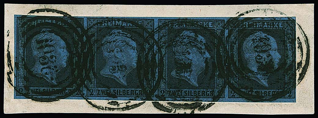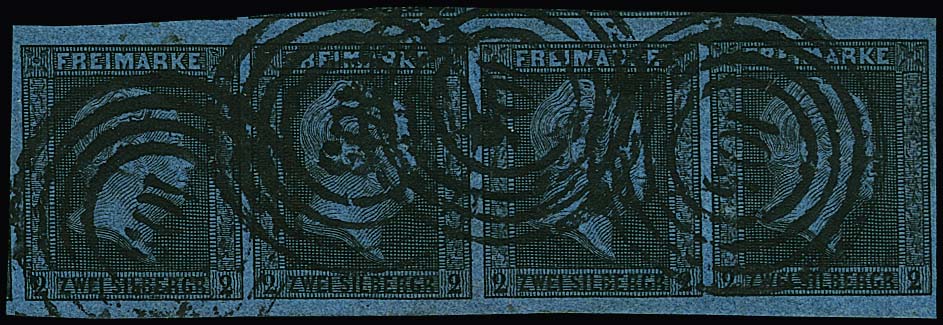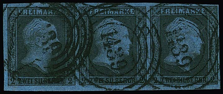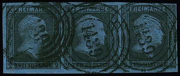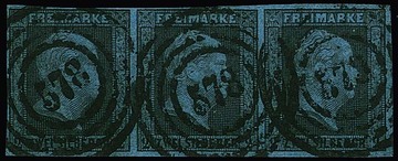 2 Sgr. schw./blau, Pracht-Dreierstreifen (ausgeprägtes und stark versetztes Wasserzeichen) mit NS "578" (Hamburg), Mi. 400,-