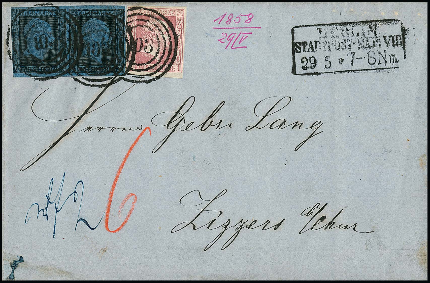 2 Sgr. schw./blau im Paar (links ber.) in Mischfrankatur mit 1 Sgr. rosa auf Faltbrief von Berlin 1858 nach Chur/Schweiz