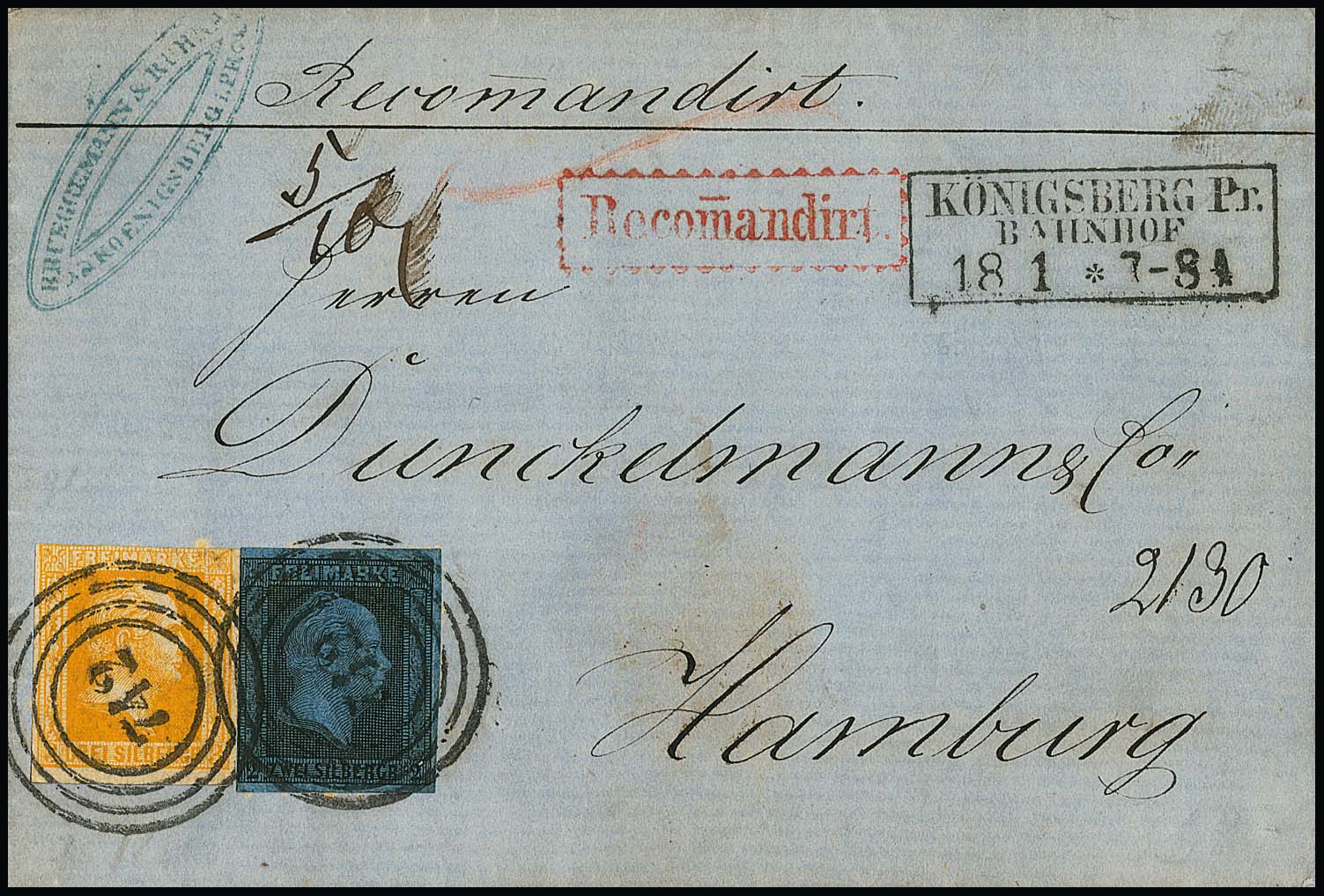 2 Sgr. schw./blau in Mischfrankatur mit 3 Sgr. orange (oben ber.) auf eingeschriebenem Postvereinsbrief von Königsberg Bahnhof (Ra3 NS "742") nach Hamburg