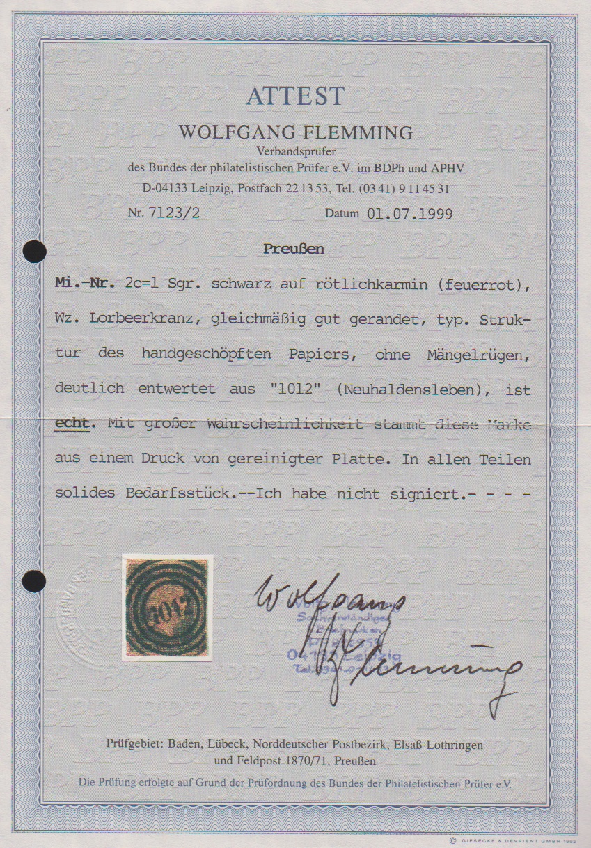 1 Sgr. schw./feuerrot, Kabinettstück mit zentrischem NS "1012" (Neuhaldensleben), Attest Flemming. Mi. 600,-