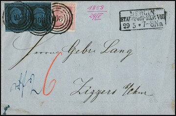2 Sgr. schw./blau, aufgrund der Qualität offensichtlich "wiedergefundene" sog. "Portemonnaie-Marke", diese vorschriftsgemäß noch mit NS "373" entwertet trotz Einzugs der Nummernstempel zum 31.3.1859, in Mischfrankatur mit 1 Sgr. karmin, Gittergrund, diese mit Ra2 "Elberfeld", auf Brief vom 8.4.1859 nach Pesth/Ungarn. Seltene Stempel-Kombination