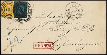 2 Sgr. schw./blau, vollrandig, in Mischfrankatur mit 3 Sgr. gelb (kl. Randfehler) auf Couvert nach Kopenhagen, NS "103" und K2 "Berlin", Weiterfrankovermerk in Höhe von 2 Sgr.