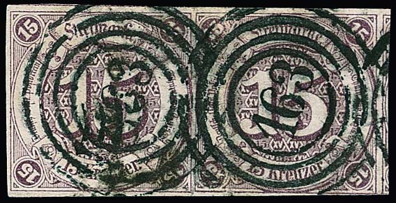 15 Kr. purpur, waagerechtes Paar mit klarem NS "163" (Worms), linke Marke riesenrandig mit Nebenmarken, rechte noch voll- bis überrandig, aber kleiner Randspalt, gut sign. Opitz