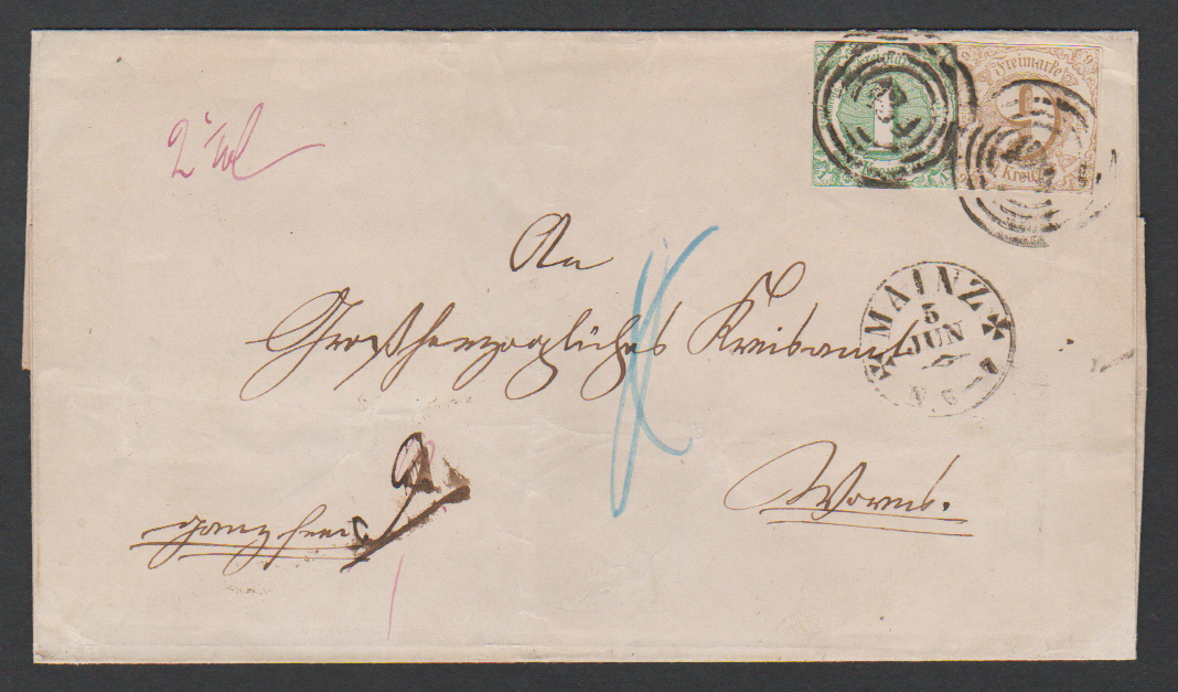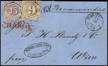 15 Kr. purpur in Mischfrankatur mit 9 Kr. ockerbraun, meist gut geschnitten, auf Chargé-Faltbrief von Darmstadt nach Wien, mit rotem Neben-L1 "Chargé"