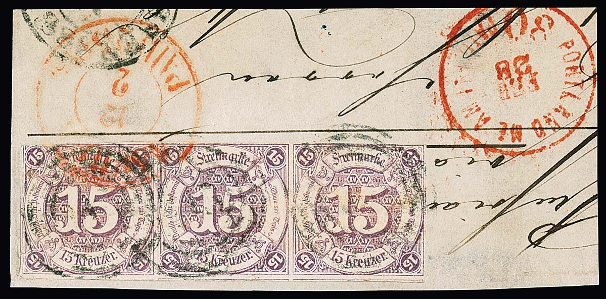15 Kr. purpur, seltener Dreierstreifen (zwei Marken vollrandig) auf Briefstück von Überseebrief mit übergehendem rotem Transit-K2 von Aachen