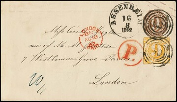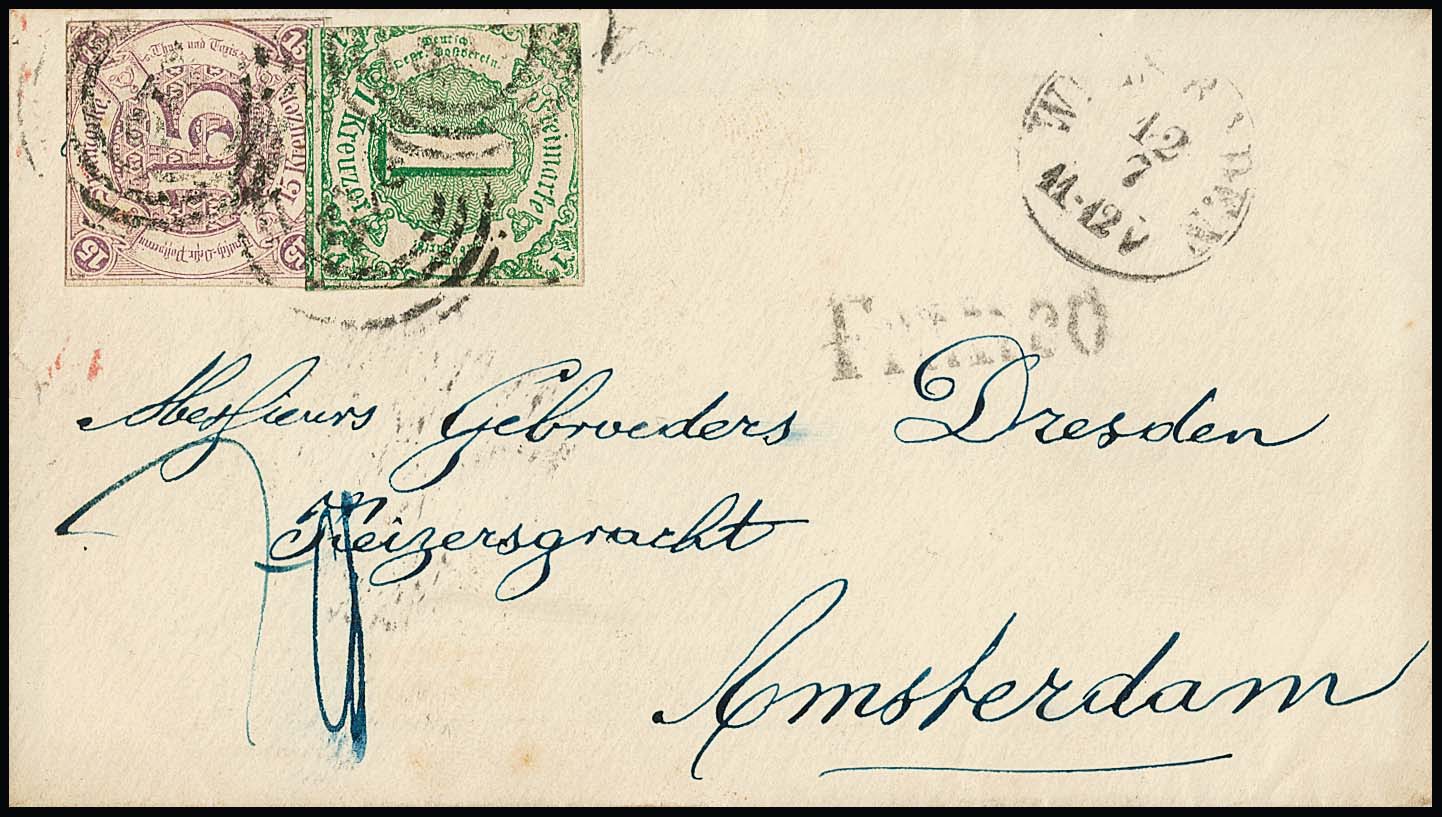 1 Kr. grün und 15 Kr. purpur, jeweils meist vollrandig, auf Damencouvert (mit Inhalt) von Wiesbaden 1803 nach Amsterdam, sign. Sommer