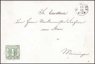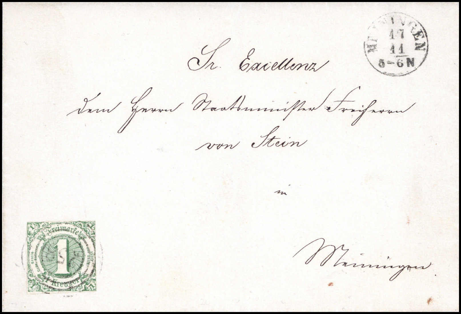 1 Kr. grün, üblich geschnittene Einzelfrankatur auf Ortsbrief mit NS "258" und K1 "Meiningen"