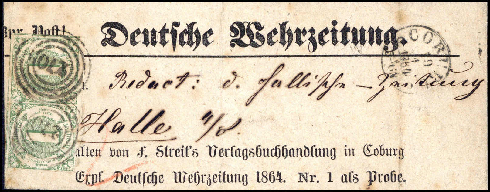 1 Kr. grün im waager. Paar mit NS "270" und K1 "Coburg" auf Vordruck-Streifband "Deutsche Wehrzeitung" in der 2. Gewichtsstufe nach Halle, leichte Fleckchen