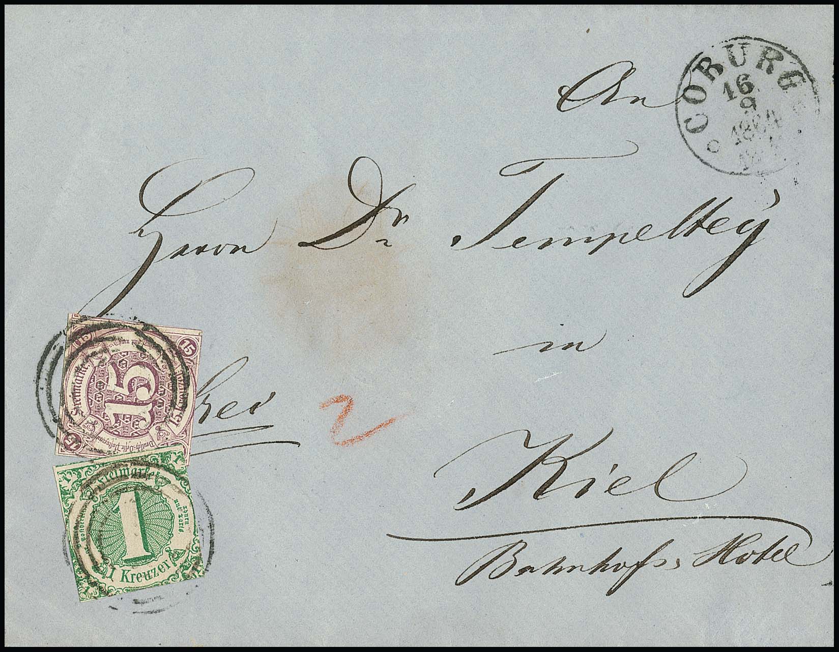1 Kr. grün nebst 15 Kr. lila, meist gut geschnittene 16-Kr.-Frankatur auf blauem Couvert von Coburg (1864) über das Taxis-Postamt in Hamburg nach Kiel (Umschlag rs. rotes Lacksiegel, welches vs. etwas durchschlägt). Zum Dänemark-Porto aus der bekannten "Tempeltey"-Korrespondenz