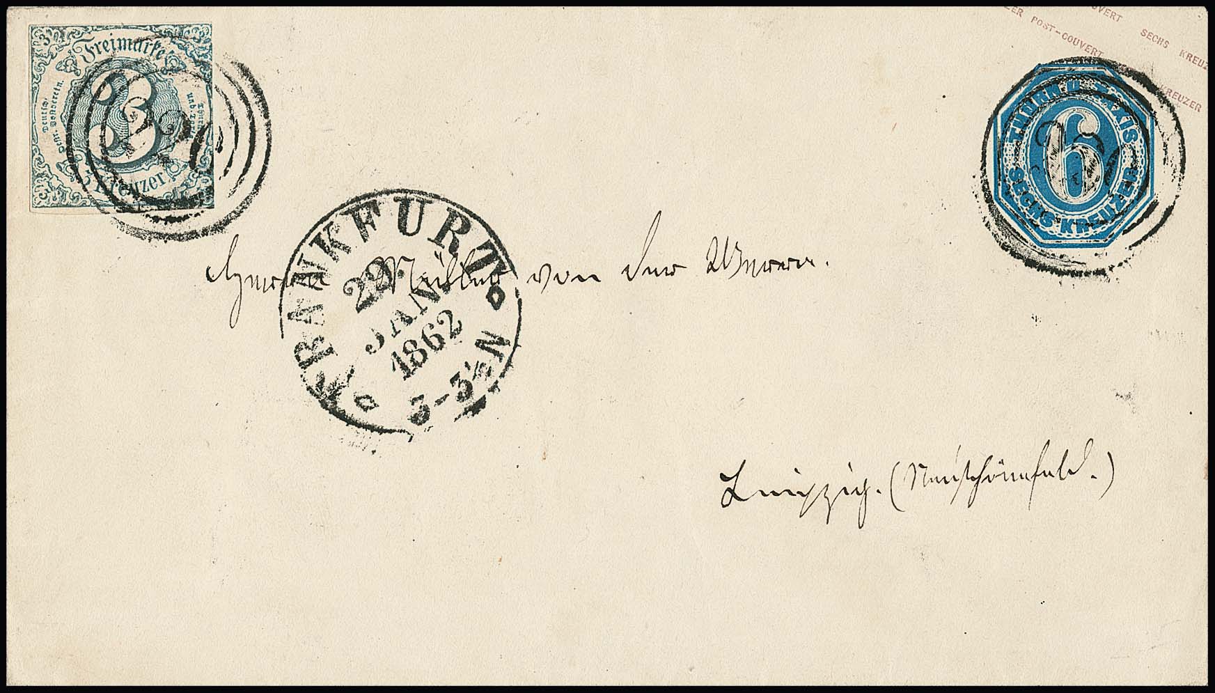 3 Kr. hellblau als Zusatzfrankatur auf Ganzsachen-Umschlag 6 Kr. blau, mit NS "220" und K1 "Frankfurt 29/1 62" nach Leipzig