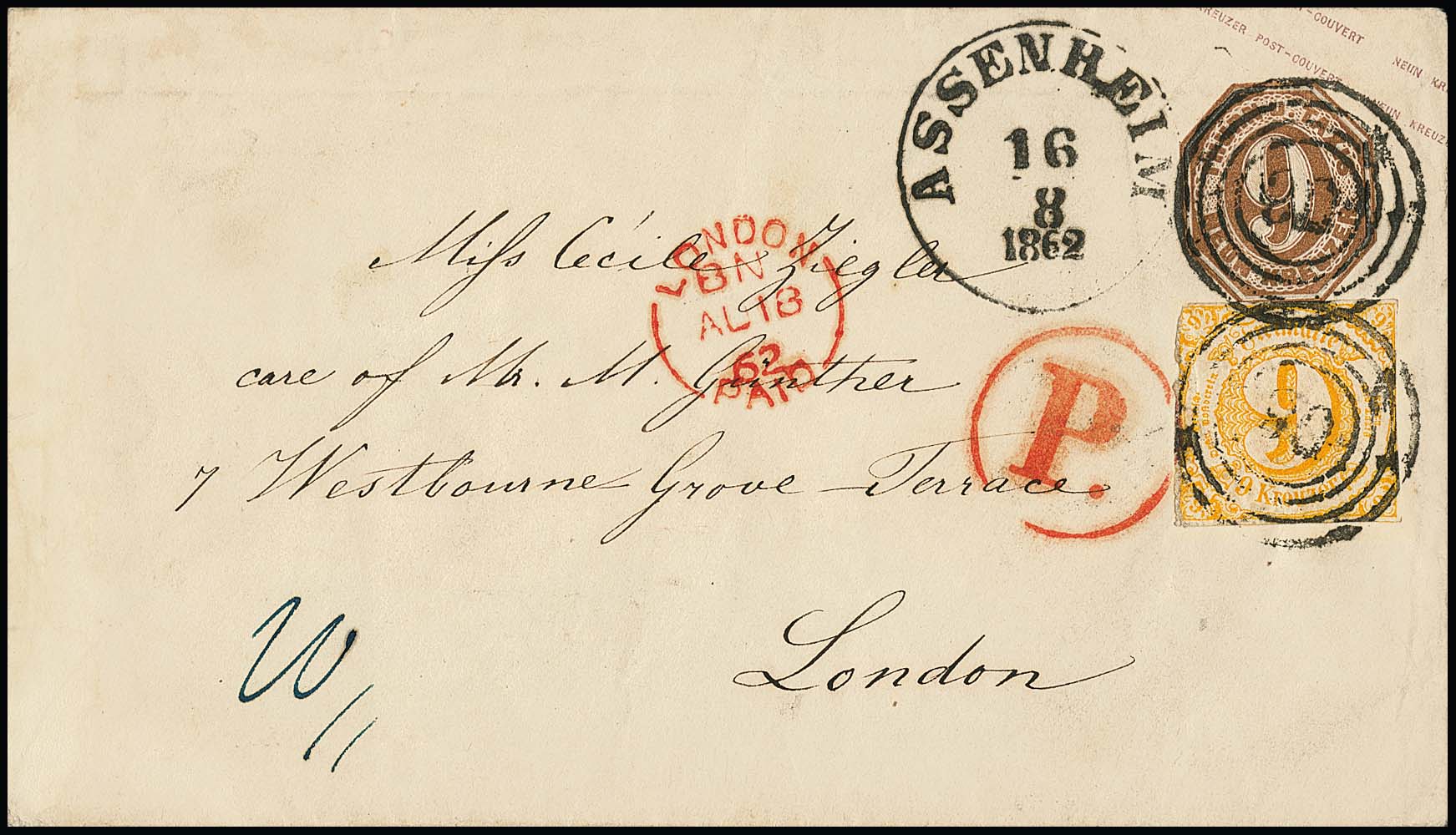 9 Kr. gelborange (kl. Mgl.) auf wertgleichem Ganzsachen-Umschlag 9 Kr. braun mit NS "90" und K1 "Assenheim" nach London, seltene Kombination