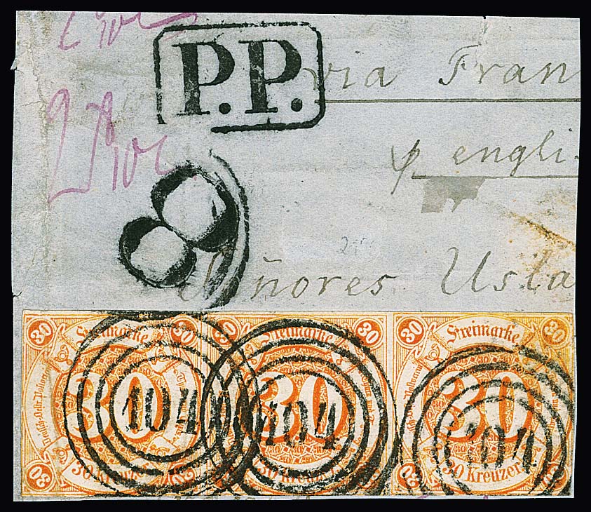 30 Kr. orange, meist vollrandiger waager. Dreierstreifen (li. Marke Falte) auf Briefstück von Mexikobrief mit NS "104" (Darmstadt), sign. Pfenninger. Mi. 4200,-