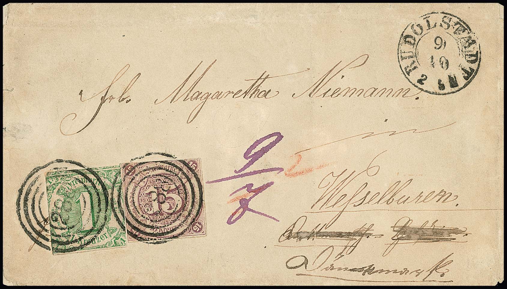 15 Kr. purpur nebst 1 Kr. grün als übliche geschnittene 16-Kr.-Frankatur auf Brief mit NS "288" und K2 "Rudolstadt" nach Dänemark (leichte Beförderungsspuren)
