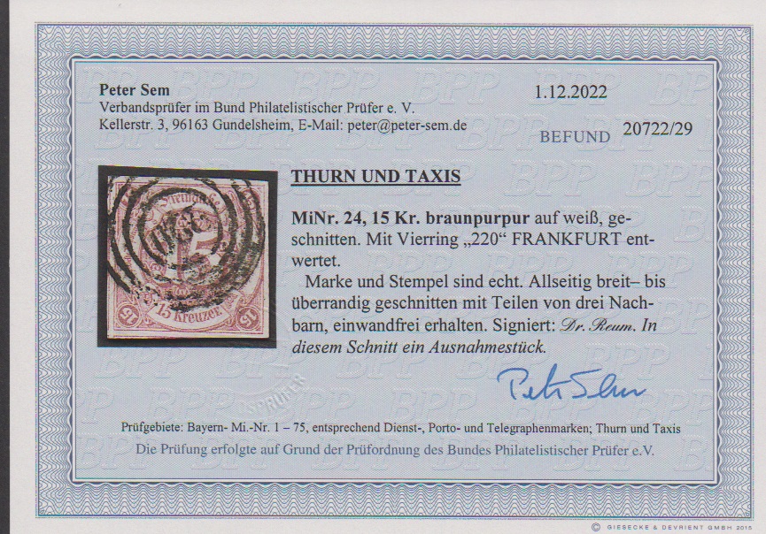 15 Kr. purpur, aussergewöhnlich riesenrandiges Kabinettstück mit klarem NS "220" (Frankfurt), Nebenmarken, sign. Reum und Fotoexp. Sem: "In diesem Schnitt ein Ausnahmestück".