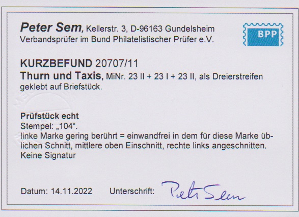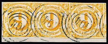 9 Kr. gelborange, drei Exemplare in den Typen II, I (oben Einschnitt) und II (links angeschnitten) auf Briefstück mit NS "104" (Darmstadt), Fotoexp. Sem