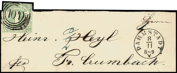 Zwei Landbestell-Streifbänder aus gleicher Korrespondenz von Darmstadt nach Fränk. Crumbach (Landbezirk von Brensbach). Einzeln mit 1 Kr. grün, farblos durchstochen (etwas Schere), hier gemäß Taxe "0/2" 2 Kr. Landbestellgeld vom Empfänger erhoben, das zweite Streifband mit einem Paar 1 Kr. grün (Schnitt siehe Foto) offensichtlich aus der Zeit, als das Landbestellgeld auf 1 Kr. reduziert wurde, hier gemäß Taxe "0/0" mit der zweiten 1 Kr. das Landbestellgeld im voraus verklebt (eine Taxe "1" insofern wieder gestrichen). Seltenes Paar!