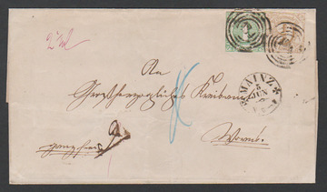 1 Kr. grün und 9 Kr. ockerbraun, meist vollrandiger Taxisschnitt, auf Bestellgeldbrief der 3. Gewichtsstufe von Mainz nach Worms