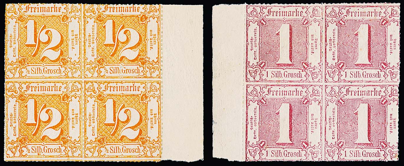 Durchstochene Serie 1865 vollständig in postfrischen Rand- bzw. Eckrand-Viererblöcken, Mi. lose (!) fast 1300,-, gerade die Werte zu 1/2 und 1 Sgr. sowie 1 und 3 Kr. sind selten!
