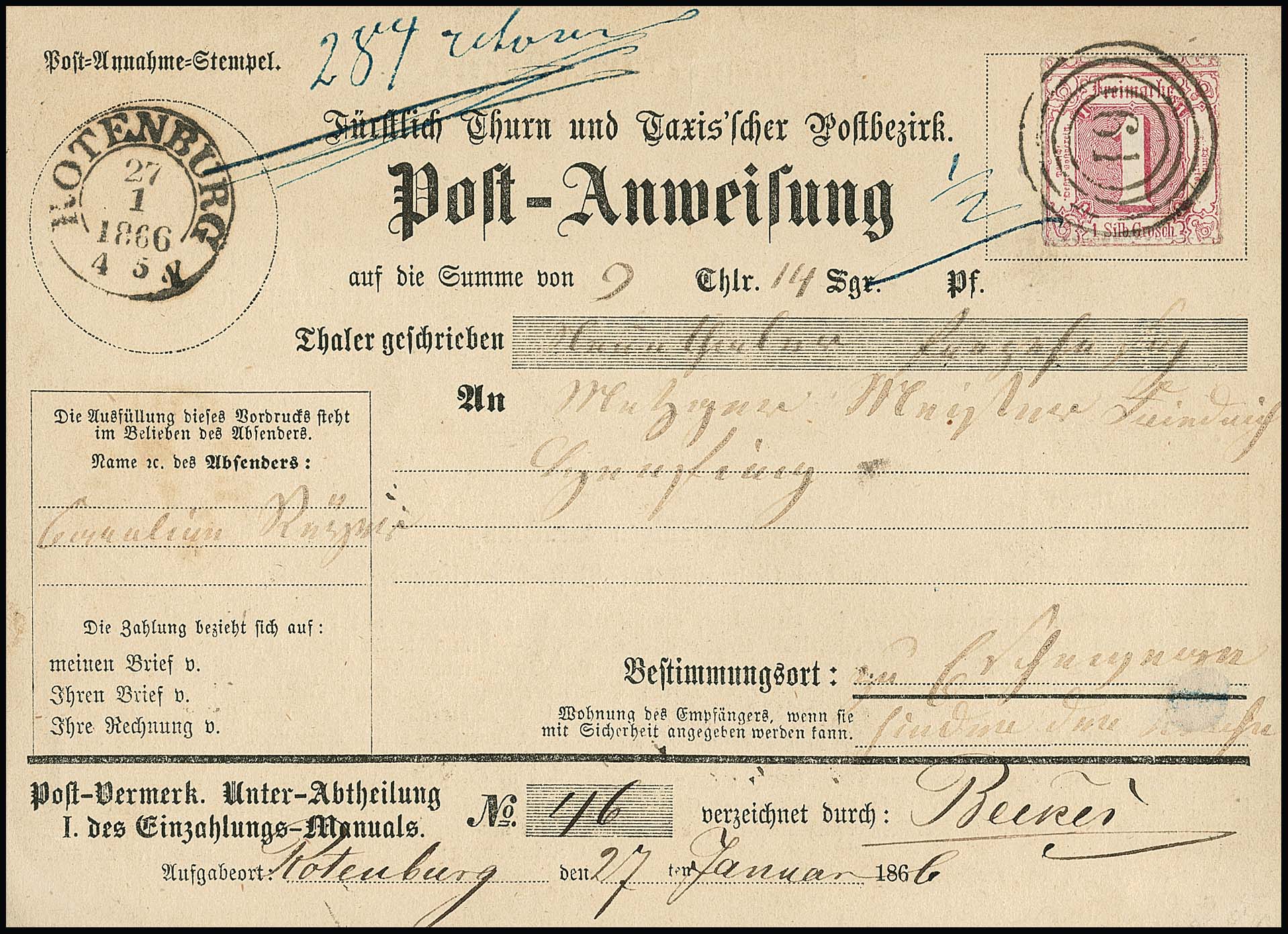 1 Sgr. rot auf Pracht-Postanweisung 1866 mit NS "61" und K2 "Rotenburg"