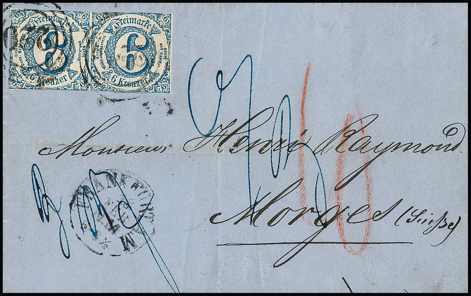 6 Kr. blau, meist vollrandiges Paar (re. Marke Vortrennschnitt rechts) auf nachtaxiertem gef. Brief von Frankfurt 1864 nach Morges/Schweiz, Nachtaxe "10" Rp.